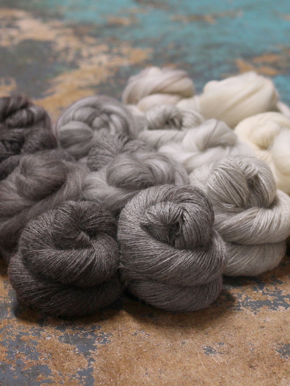 The Devon Naturals range is a curated selection of local wool in undyed gradient shades. It is available in two blends: one consisting of Exmoor Blueface and Zwartbles, and the other of Grey Exmoor Blueface and Romney.